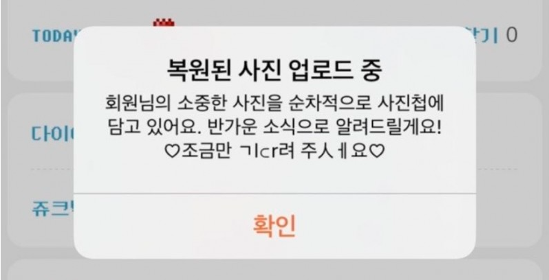 알림과 함께 앨범을 복원하려면 앨범을 클릭합니다. 참고로 복원된 사진은 다운로드 및 확대가 불가능하며, 사진 수에 따라 시간이 오래 걸릴 수 있습니다. 동일한 방법으로 일지를 복원할 수 있으므로 일지를 복원하려면 동일한 방법으로 진행하십시오.
